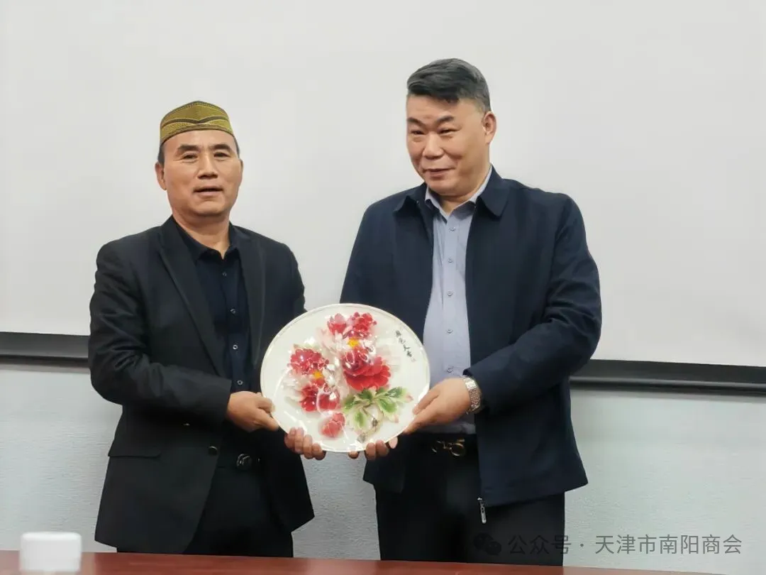 座谈会最后,洛阳市南阳商会党支部书记李士晋向天津市南阳商会会长李忠献、洛阳市南阳商会镇平分会会长杜殿敬向天津市河南镇平商会会长王聚范赠送了雕刻有洛阳牡丹图案的精美洛瓷工艺品。